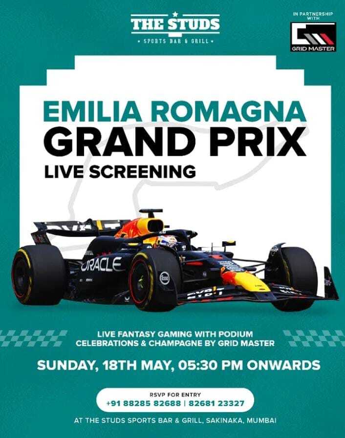 Join us for an evening of high-speed thrills and adrenaline-pumping action as Studs Sports Bar and Grid Master bring you the 2025 live screening experience for the Emilia-Romagna Grand Prix in Mumbai! Expect pre-race banter, Grid Master Live Fantasy Contest & exciting prizes for the winners, Trivia & Race Prediction Prizes, Podium celebration with Grid Master Live and so much more!